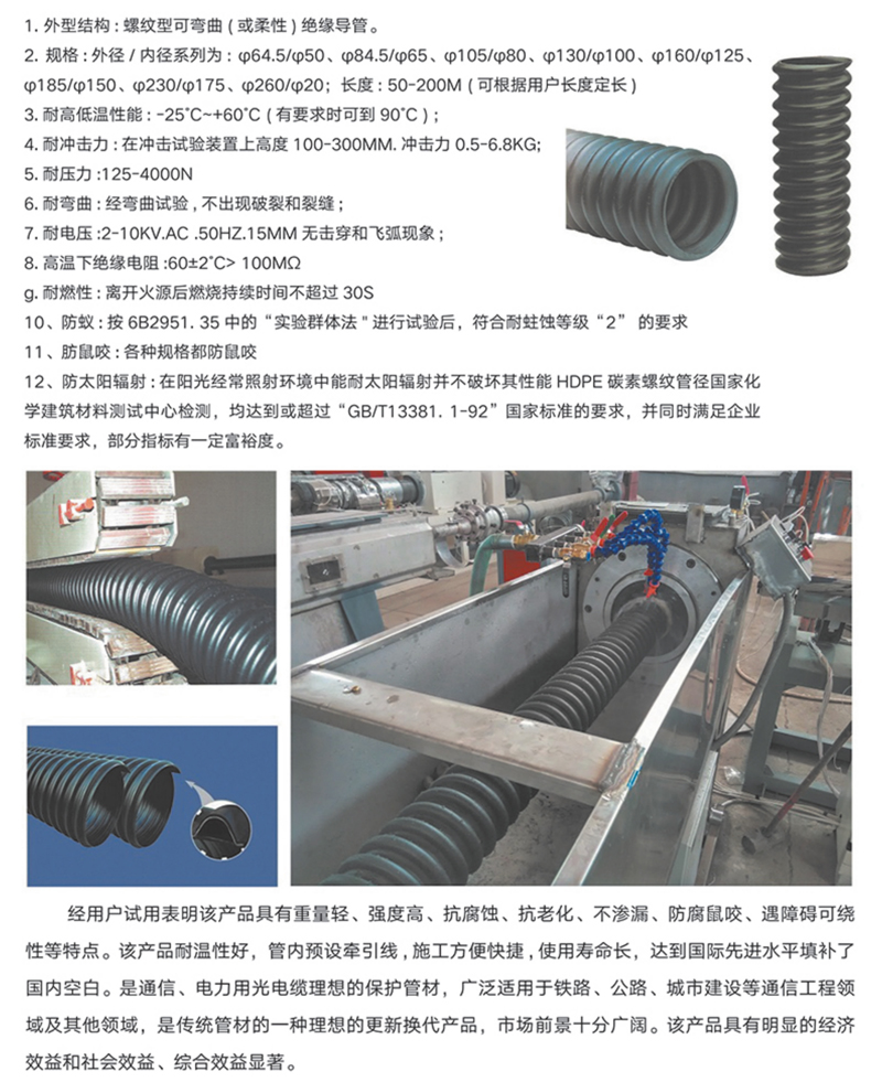 HDPE碳素管是采用HDPE(高密度聚乙烯)與碳素復(fù)合材料擠出成型制造的一種單壁、螺紋復(fù)合管材,可用于光(電)纜外套保護(hù),適用于通信工程、電力工程等領(lǐng)域、具有高強(qiáng)度、高韌性、耐腐蝕、不變型、防腐滲漏、抗震、抗壓等特點(diǎn)。